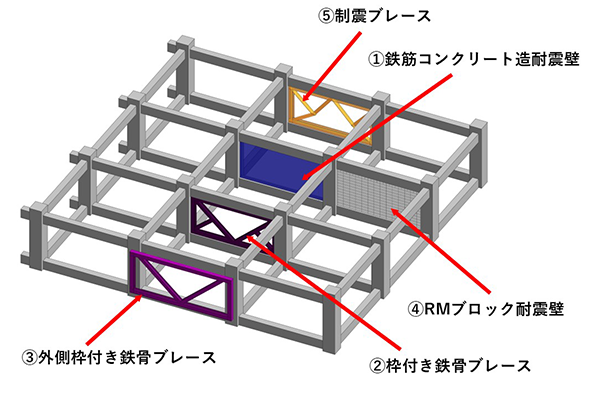 「RC耐震壁」、「構⾯内鉄⾻ブレース」などの様々な補強⼯法に使⽤することができます。